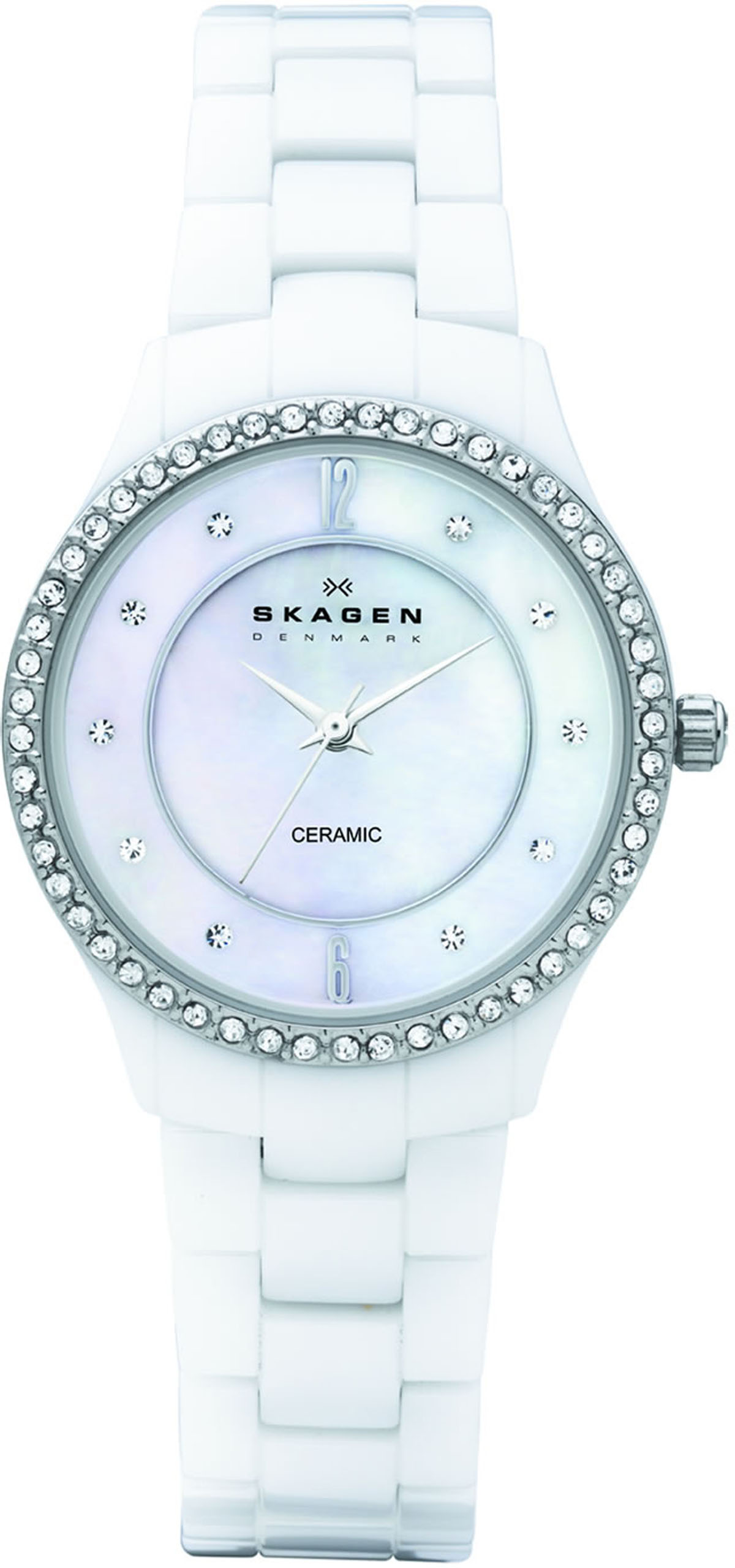 £183.00 Ladies Skagen stone set bracelet watch with a mother of pearl dial and mineral glass. Including 30m water resistancy.Email Us about the "Ladies Skagen Watch 347SSXWC"