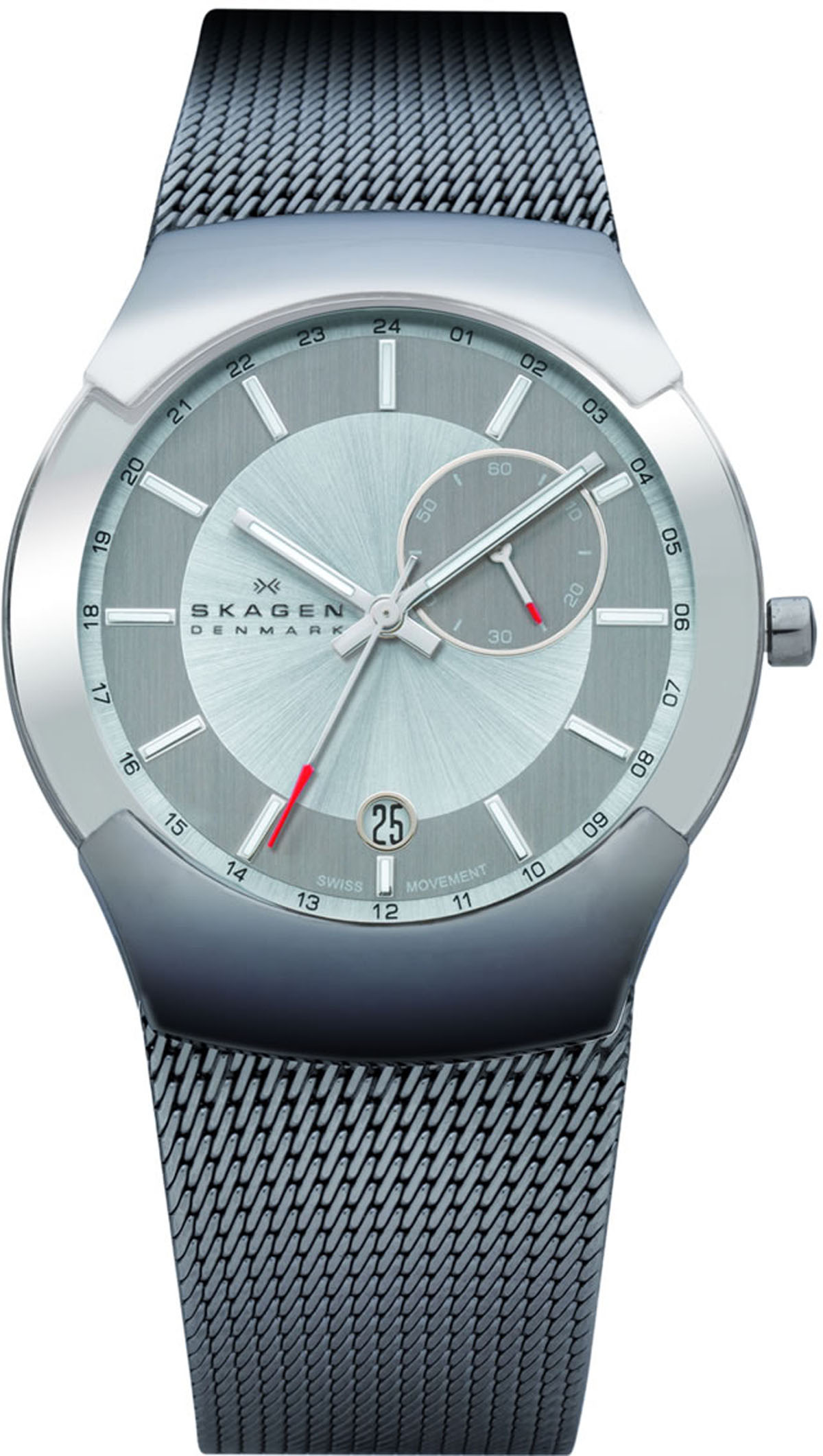 £204.00 Men's Skagen grey mesh strap chronograph watch with a silver dial, mineral glass and date display. Including 30m water resistancy.Email Us about the "Mens Skagen Watch 983XLSSC"