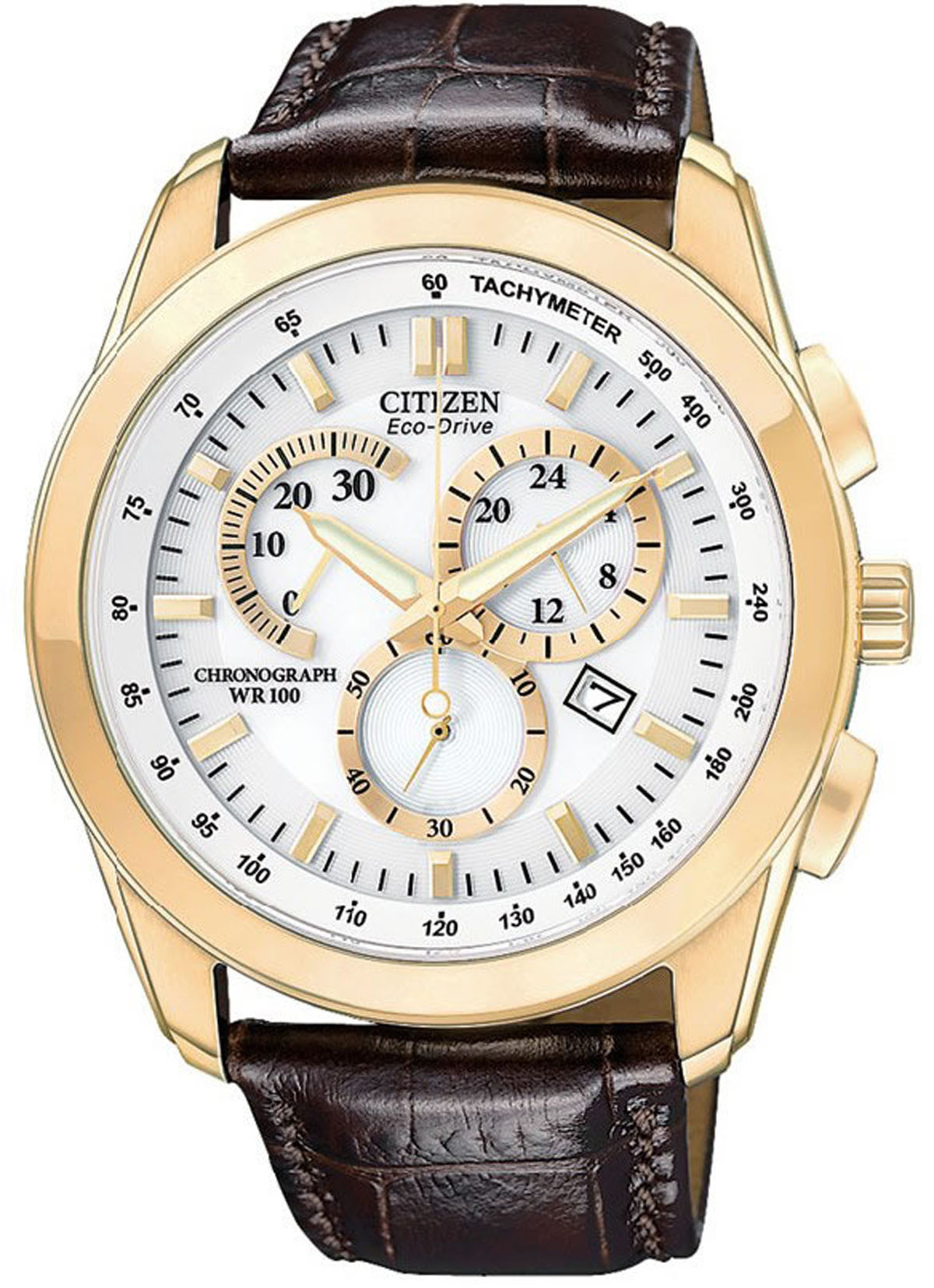 £169.00 Men's Citizen gold plated brown leather strap watch with a white dial, mineral glass and date display. Including 100m water resistancy.Email Us about the "Mens Citizen Watch AT1183-07A"