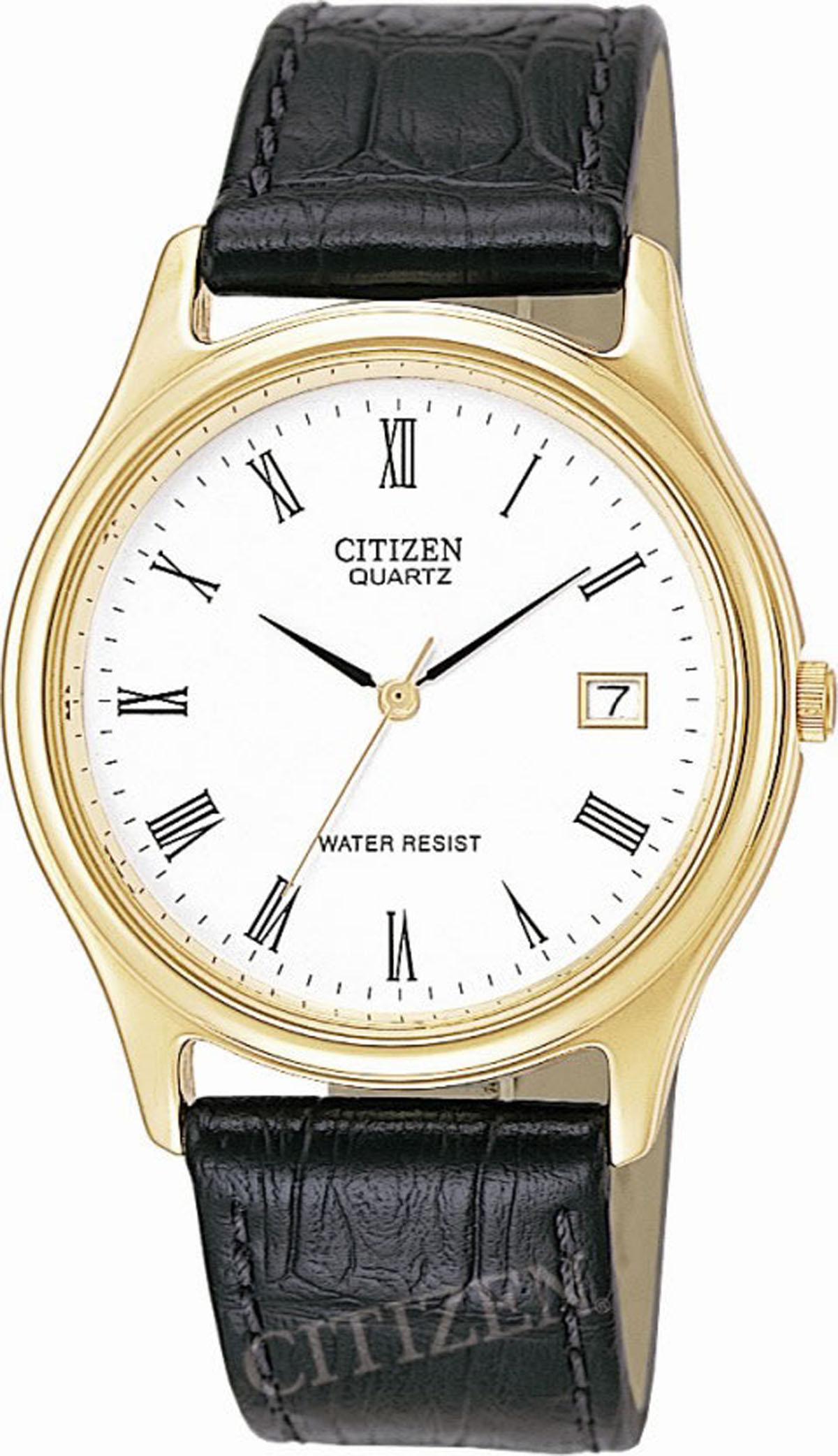 £50.00 Men's Citizen gold plated black leather strap watch with a white dial, mineral glass and date display. Including splash proof water resistancy.Email Us about the "Mens Citizen Watch BI0732-01B"