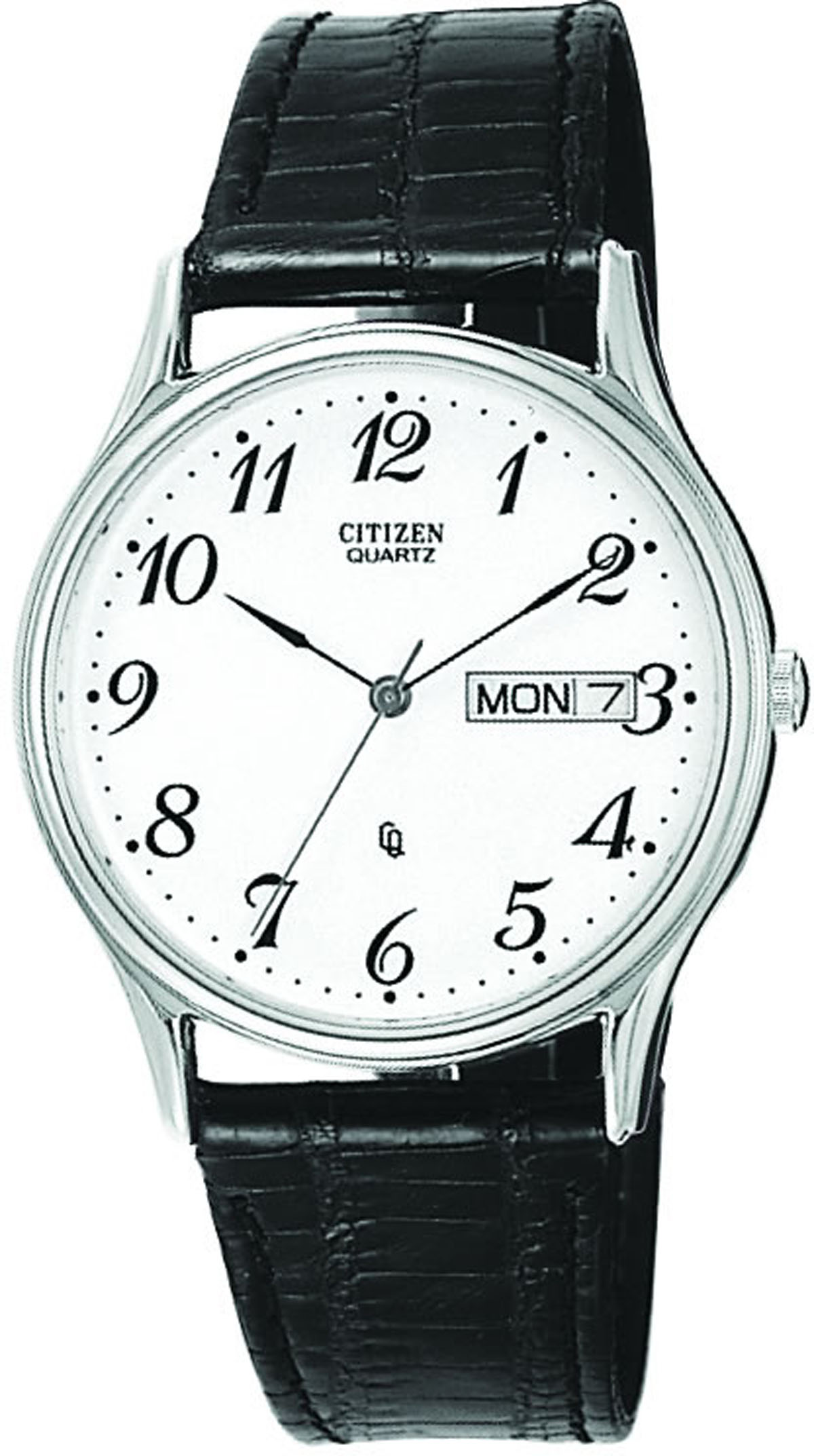 £50.00 Men's Citizen stainless steel black leather strap watch with a white dial, mineral glass and day/ date display.Email Us about the "Mens Citizen Watch BK3300-03A"