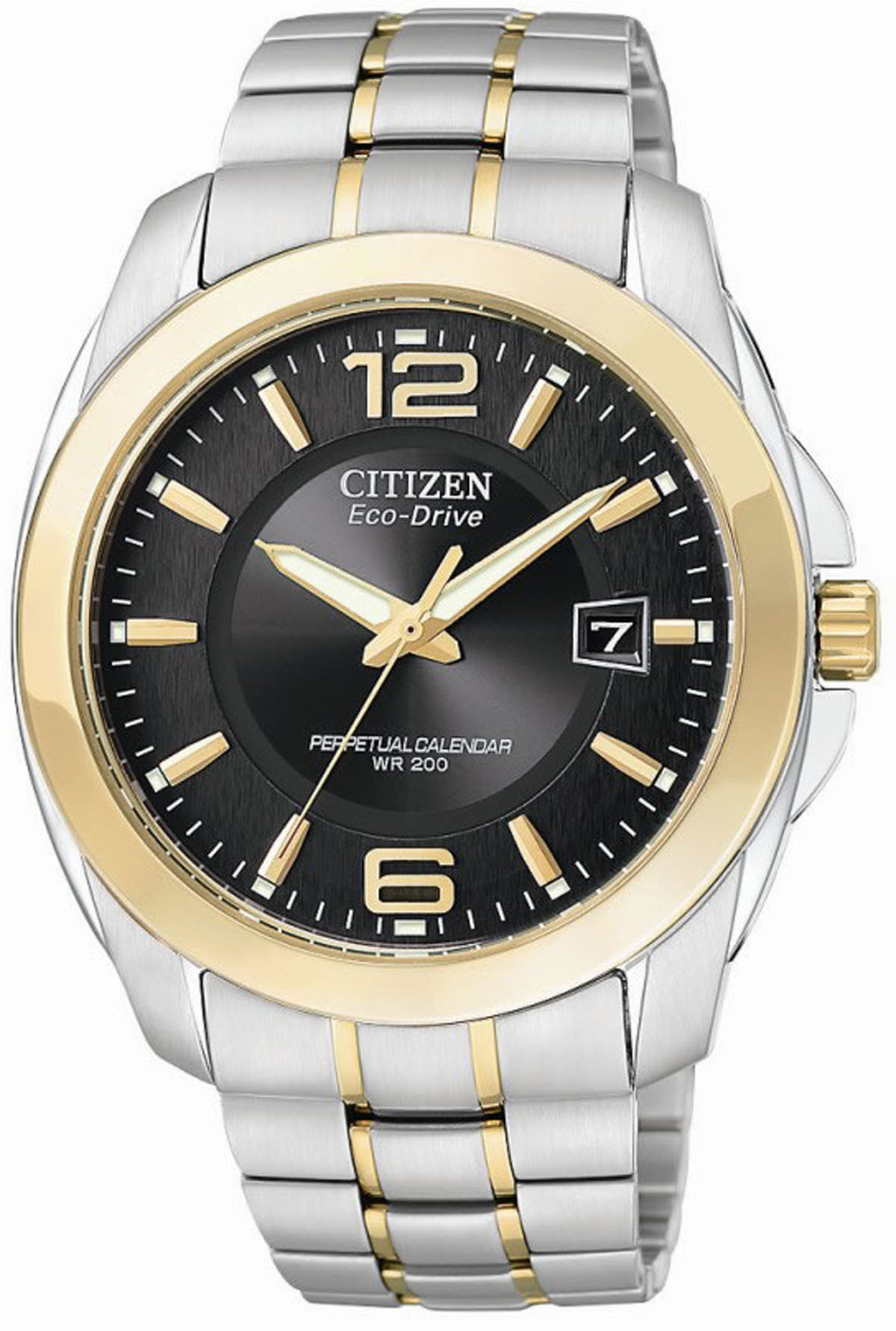 £194.00 Men's Citizen bracelet watch with a black dial, mineral glass and perpetual calendar display. Including 200m water resistancy.