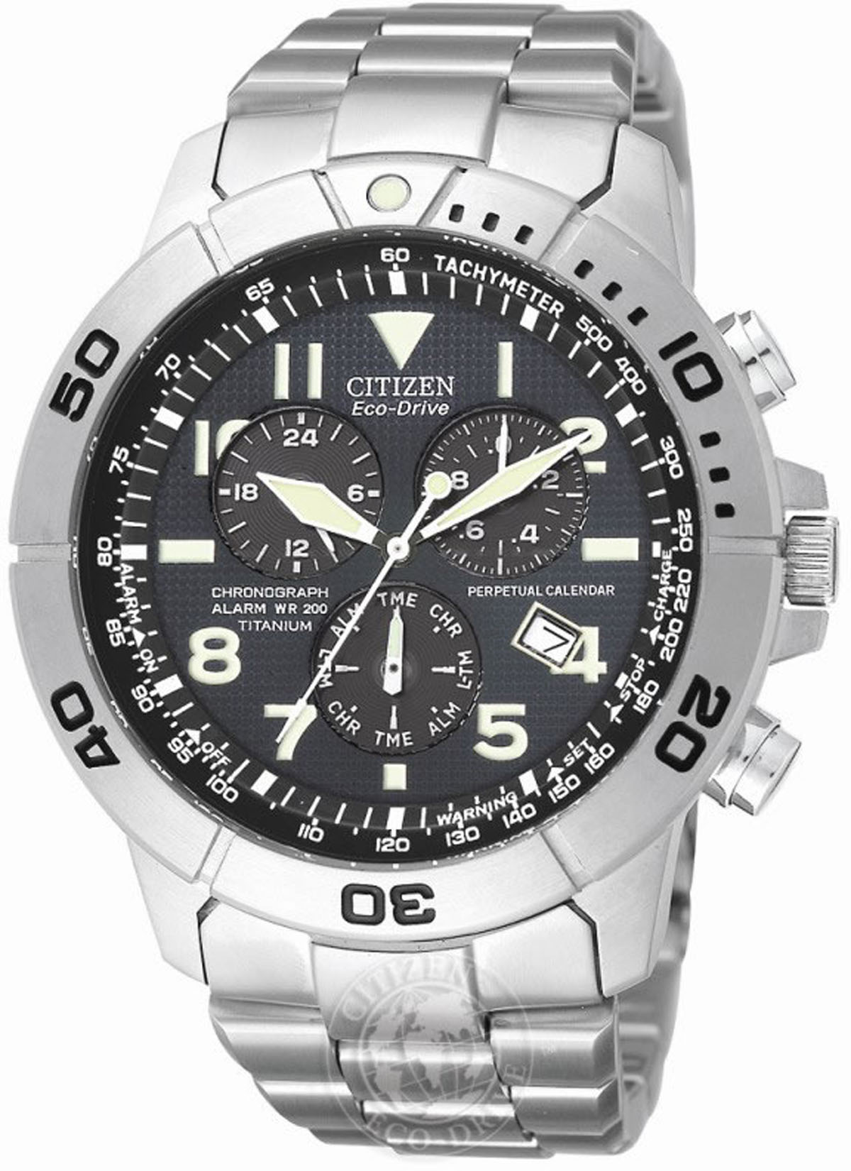 £299.00 Men's Citizen titanium bracelet chronograph watch with a blue dial, mineral glass and perpetual calendar display. Including 200m water resistancy.